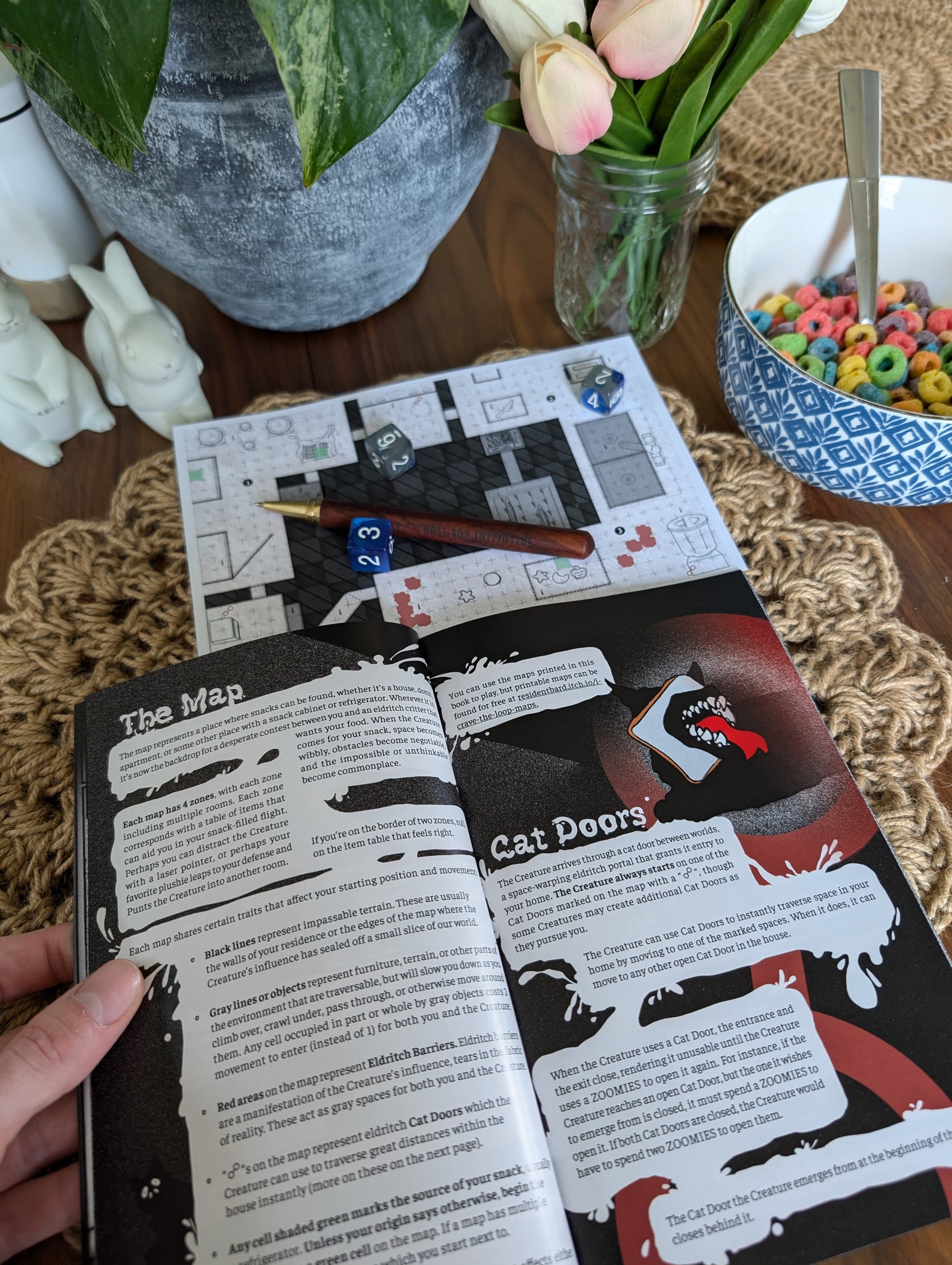 The quiet patter of otherworldly feet. A distant, plaintive yowl. A creature with too many eyes and a sleepless hunger oozes from the walls and wriggles into a familiar shape. It smells your intent. It hears the sound of every spoonful. It whets its appetite on the mere possibility of your food. It hungers for your loops, and its craving will not be denied.