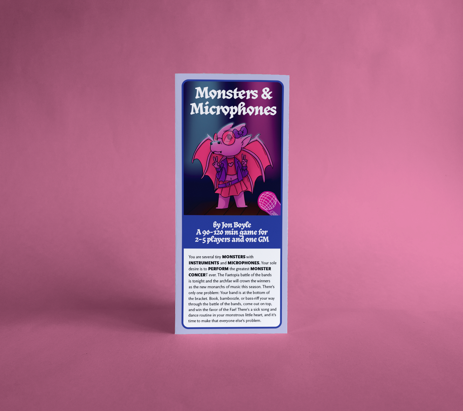 Monsters and Microphones is a one-shot roleplaying game about a monstrous battle of the bands. Form a monster band with your favorite cryptids, creatures, and mythical monsters, face off against other monster bands, and impress a pun-tastic cast of judges to be crowned the monarchs of music!