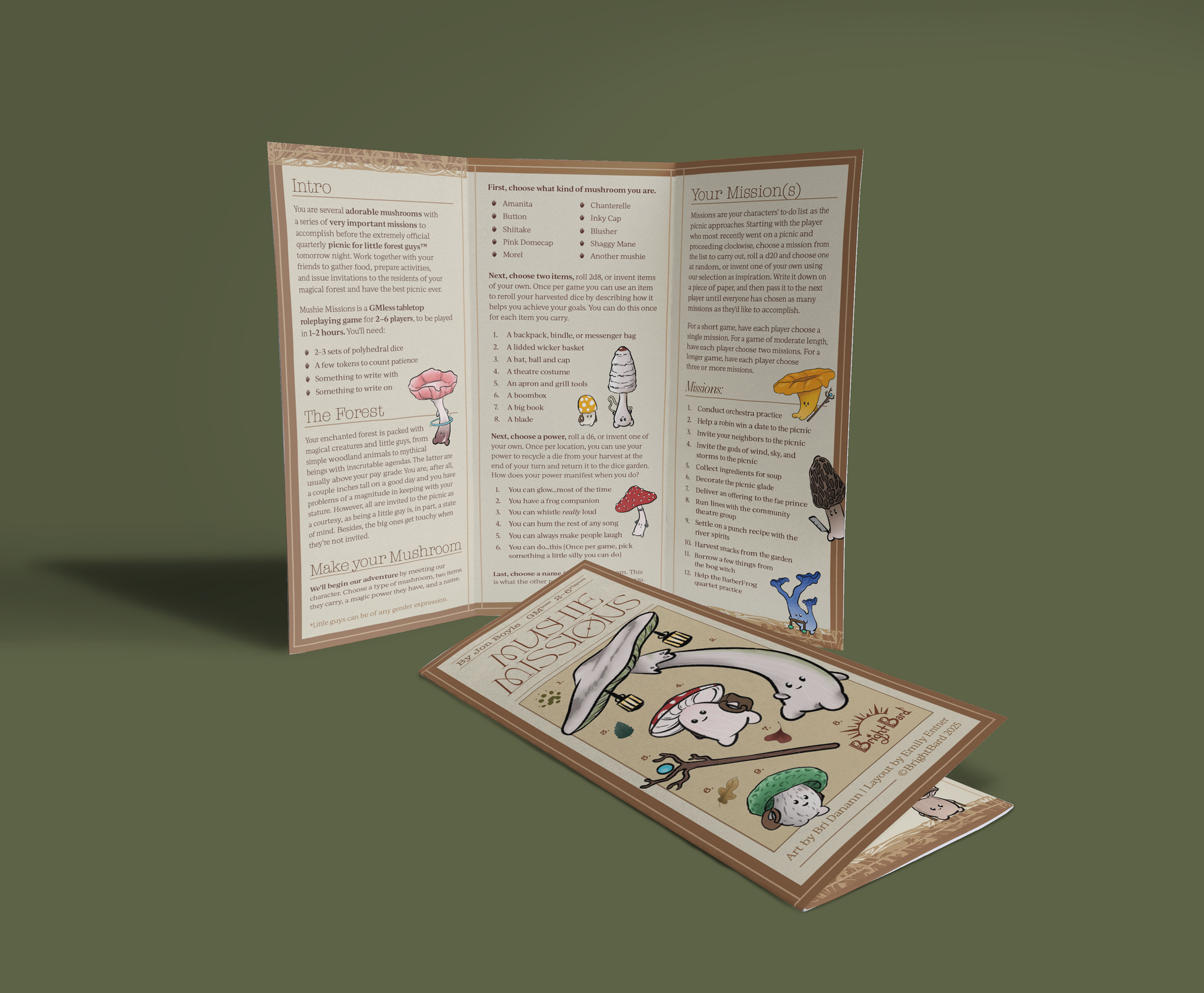 Mushie Missions is a whimsical one-shot tabletop roleplaying game about tiny mushrooms on a big mission to host the quarterly picnic for little guys™. Travel the forest together, invite creatures great and small to the picnic, and make sure every last detail is just so for the shindig tomorrow night.