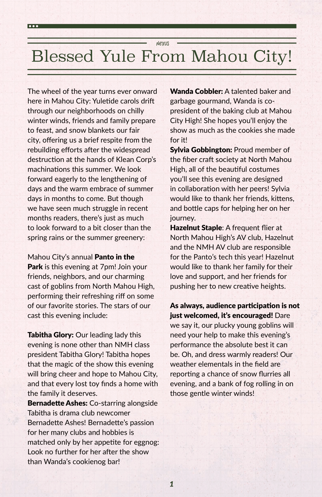 Trash to Treasure: Panic at the Panto is a holiday-themed one-shot adventure compatible with Trash to Treasure, our eco-fantasy tabletop roleplaying game about magical girl trash goblins fighting pollution and corporate greed. Investigate a mysterious storm and a missing pantomime cast member on the eve of your holiday performance, and save the show before it's too late!